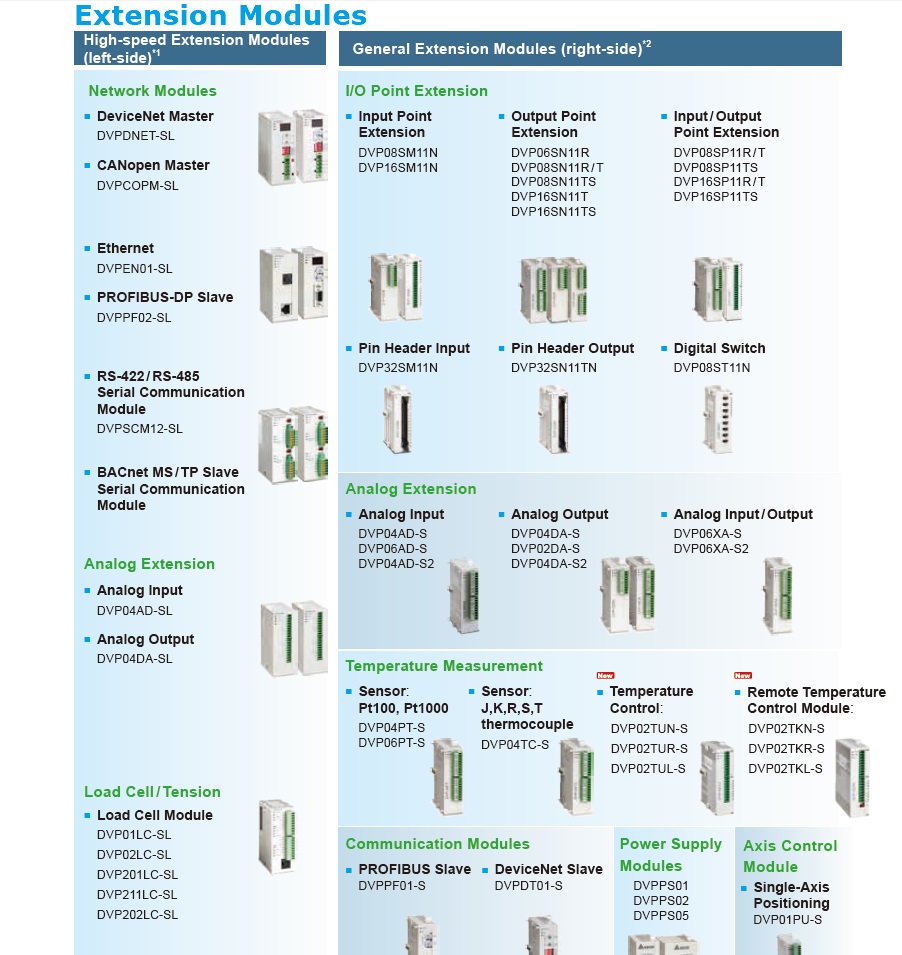 La delgada y compacta serie micro DVP-S viene con una variedad de características y está disponible en cinco unidades principales de procesadores (MPU). El DVP-SS MPU ofrece la forma más fácil y las funciones básicas para el control secuencial, mientras que el DVP-SA MPU ofrece un programa de mayor capacidad y eficiencia de operación. El DVP-SX MPU apoya entrada / salida digitales y dispone de múltiples canales analógicos de entrada I/O (Entrada/Salida). Ofrece alta velocidad en los pulsos de salida y funciones de conteo de pulso, el DVP-SC MPU es el más adecuado para el control de movimiento. El sofisticados DVP-SV MPU ofrece en el lado izquierdo extensiones interfase de alta velocidad que permite la conexión a una variedad de interfases de red (por ejemplo, Ethernet, DeviceNet, Profibus).